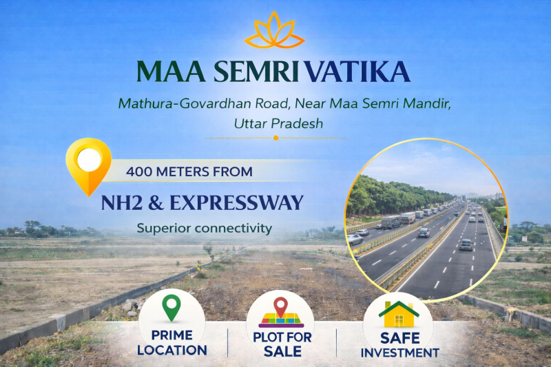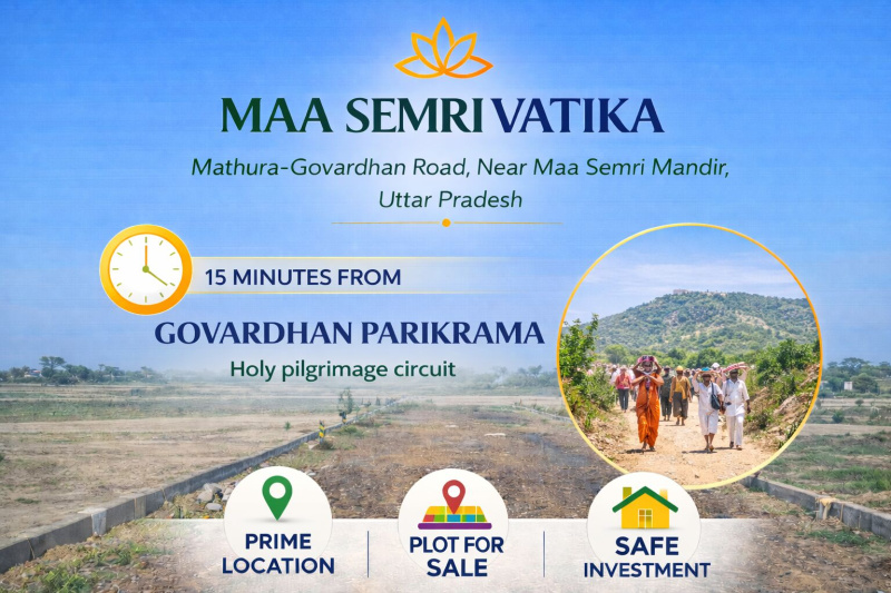 Maa Semri Vatika\r\nA World-Class Premium Elite Township for Your Family - Elite Living in Holy Braj\r\n\r\nExperience world-class township living at Maa Simri Vatika - the premium gated colony that redefines luxury in the holy land of Braj. Perfectly positioned at the center of Vrindavan, Mathura City, and Govardhan, this elite community offers grand entrance gates, lush green parks, and wide blacktop roads. With 24-month easy EMI and proximity to the sacred Maa Semri Mandir, this is where modern luxury meets spiritual peace.\r\n\r\nPremium Amenities:\r\nPremium- Grand Entrance Gate: Architecturally designed entrance with security cabin and decorative lighting\r\nLifestyle- Lush Green Parks: Professionally landscaped gardens with walking tracks and seating areas\r\nInfrastructure- Wide Blacktop Roads: 40ft main roads and 30ft internal roads - wider than city standards\r\nSocial- Community Club: Modern clubhouse with indoor games and event space\r\nSpiritual- Temple Complex: Beautiful temple inside society for daily prayers\r\nFamily- Kids Playground: Safe play area with modern equipment for children\r\n\r\nPremium features & benefits:\r\nWorld-Class Premium Township in Holy Braj\r\nStrategic Center Point: Vrindavan-Mathura-Govardhan\r\nGrand Entrance Gate with Architectural Excellence\r\nLush Green Parks with Landscaped Gardens\r\nWide Blacktop Roads (40ft Main, 30ft Internal)\r\nPremium Amenities - Club, Temple, Playground\r\nElite Community Living - Best Families\r\n24-Month Easy EMI - Most Flexible Payment\r\n\r\n1 Minute distance from Maa Simri Mandir, Sacred temple with divine history\r\n12 Minutes from Vrindavan Temples, all major Krishna temples\r\n10 Minutes from Mathura City Center, Shopping, hospitals, schools\r\n15 Minutes from Govardhan Parikrama, Holy pilgrimage circuit\r\n400 meters from NH2 & Expressway, Superior connectivity
