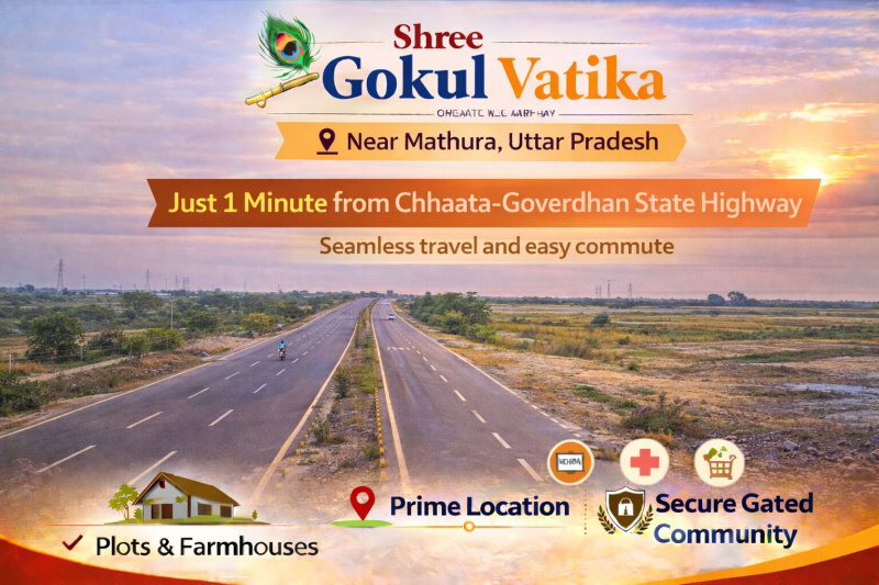 Shree Gokul Vatika Premium Property On Very Prime locality Located nearby NH2 main highway Professional Planning Meets World-Class Infrastructure Experience the difference of professional township planning at Shree Gokul Vatika. Unlike ordinary colonies with narrow roads and no security, we offer 30ft wide blacktop roads, 24/7 CCTV surveillance, and complete infrastructure. Located strategically on NH2 near Mathura, this investment-grade gated community sets new standards for quality living. Every detail is professionally planned for your family's comfort and safety. 30 feet Wide Roads, 24/7 CCTV Monitored, Approved Planned Layout Premium features & benefits: 30ft Wide Blacktop Roads - Professional Infrastructure 24/7 CCTV Surveillance - Complete Security Coverage Professionally Planned Layout - Government Approved Complete Underground Drainage System Street Lights on Every Road Grand Entrance Gate with Security Cabin Green Parks & Plantation Throughout 0% Interest EMI - Investment Grade Property World-Class Amenities: Gated Community, 24/7 Security, Water Supply, Green Spaces, Wide Roads. Nearby Landmarks: NH2 National Highway: 2 Minutes, Prime highway frontage location Mathura City Center: 10 Minutes, All civic amenities nearby Upcoming Airport: 20 Minutes, Future connectivity boost Gokul Temples: 5 Minutes, Historic Krishna Leela sites Expressway Access: 15 Minutes, Yamuna Expressway nearby 10 minute distance from Railway Station: Chhaata 2 minute distance from Sahar market 1 minute distance from Chhaata Goverdhan State highway