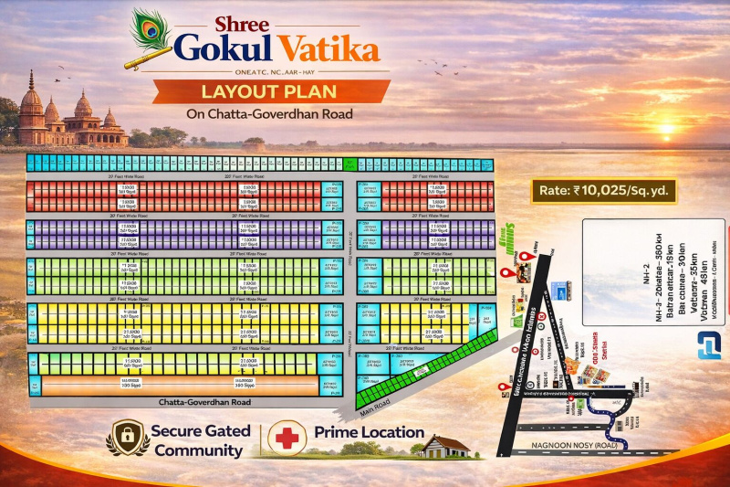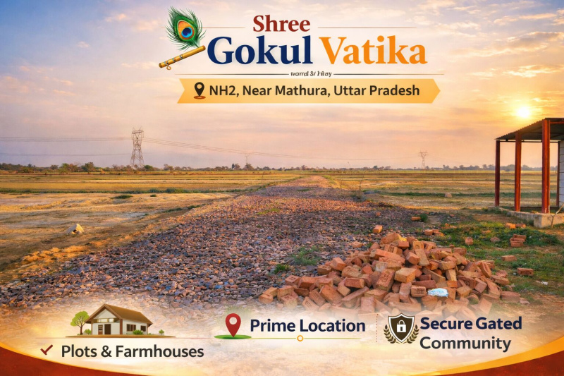 Shree Gokul Vatika Premium Property On Very Prime locality Located nearby NH2 main highway Professional Planning Meets World-Class Infrastructure Experience the difference of professional township planning at Shree Gokul Vatika. Unlike ordinary colonies with narrow roads and no security, we offer 30ft wide blacktop roads, 24/7 CCTV surveillance, and complete infrastructure. Located strategically on NH2 near Mathura, this investment-grade gated community sets new standards for quality living. Every detail is professionally planned for your family's comfort and safety. 30 feet Wide Roads, 24/7 CCTV Monitored, Approved Planned Layout Premium features & benefits: 30ft Wide Blacktop Roads - Professional Infrastructure 24/7 CCTV Surveillance - Complete Security Coverage Professionally Planned Layout - Government Approved Complete Underground Drainage System Street Lights on Every Road Grand Entrance Gate with Security Cabin Green Parks & Plantation Throughout 0% Interest EMI - Investment Grade Property World-Class Amenities: Gated Community, 24/7 Security, Water Supply, Green Spaces, Wide Roads. Nearby Landmarks: NH2 National Highway: 2 Minutes, Prime highway frontage location Mathura City Center: 10 Minutes, All civic amenities nearby Upcoming Airport: 20 Minutes, Future connectivity boost Gokul Temples: 5 Minutes, Historic Krishna Leela sites Expressway Access: 15 Minutes, Yamuna Expressway nearby 10 minute distance from Railway Station: Chhaata 2 minute distance from Sahar market 1 minute distance from Chhaata Goverdhan State highway