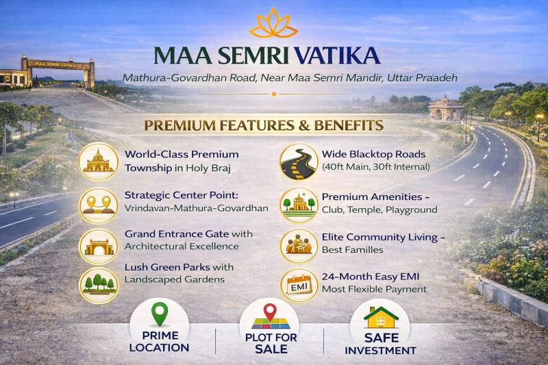 Maa Semri Vatika A World-Class Premium Elite Township for Your Family - Elite Living in Holy Braj Experience world-class township living at Maa Simri Vatika - the premium gated colony that redefines luxury in the holy land of Braj. Perfectly positioned at the center of Vrindavan, Mathura City, and Govardhan, this elite community offers grand entrance gates, lush green parks, and wide blacktop roads. With 24-month easy EMI and proximity to the sacred Maa Semri Mandir, this is where modern luxury meets spiritual peace. Premium Amenities: Premium- Grand Entrance Gate: Architecturally designed entrance with security cabin and decorative lighting Lifestyle- Lush Green Parks: Professionally landscaped gardens with walking tracks and seating areas Infrastructure- Wide Blacktop Roads: 40ft main roads and 30ft internal roads - wider than city standards Social- Community Club: Modern clubhouse with indoor games and event space Spiritual- Temple Complex: Beautiful temple inside society for daily prayers Family- Kids Playground: Safe play area with modern equipment for children Premium features & benefits: World-Class Premium Township in Holy Braj Strategic Center Point: Vrindavan-Mathura-Govardhan Grand Entrance Gate with Architectural Excellence Lush Green Parks with Landscaped Gardens Wide Blacktop Roads (40ft Main, 30ft Internal) Premium Amenities - Club, Temple, Playground Elite Community Living - Best Families 24-Month Easy EMI - Most Flexible Payment 1 Minute distance from Maa Simri Mandir, Sacred temple with divine history 12 Minutes from Vrindavan Temples, all major Krishna temples 10 Minutes from Mathura City Center, Shopping, hospitals, schools 15 Minutes from Govardhan Parikrama, Holy pilgrimage circuit 400 meters from NH2 & Expressway, Superior connectivity