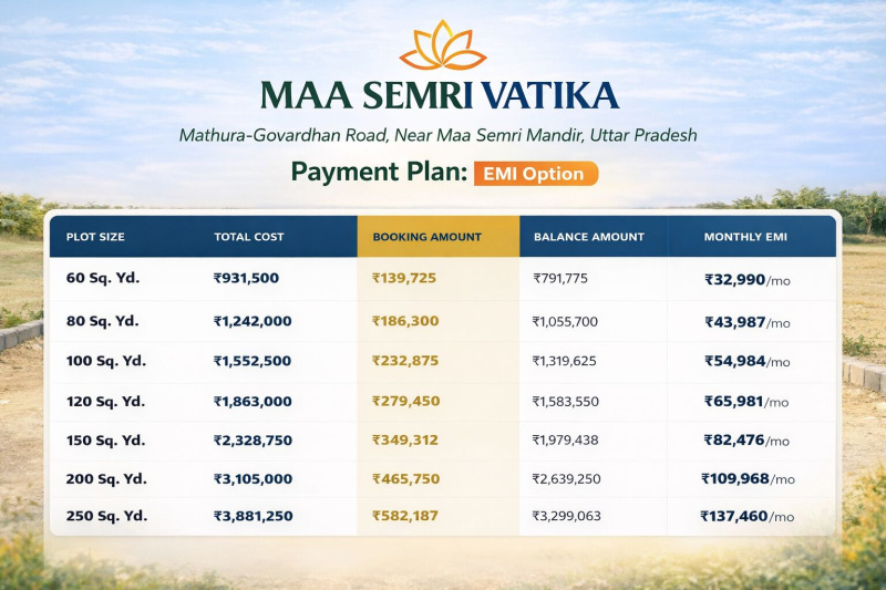 Experience world-class township living at Maa Simri Vatika - the premium gated colony that redefines luxury in the holy land of Braj. Perfectly positioned at the center of Vrindavan, Mathura City, and Govardhan, this elite community offers grand entrance gates, lush green parks, and wide blacktop roads. With 24-month easy EMI and proximity to the sacred Maa Semri Mandir, this is where modern luxury meets spiritual peace.